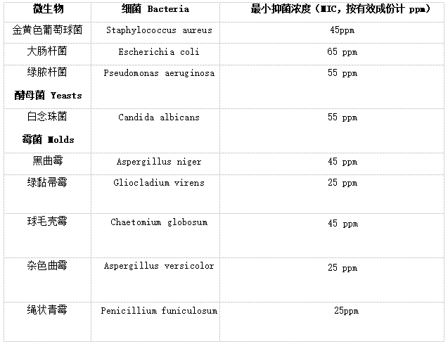 殺菌廣譜,抗菌、防霉;不流失,高效,穩(wěn)定,長(zhǎng)效; 可以與食品接觸;在強(qiáng)紫外線和酸雨條件下穩(wěn)定;環(huán)保,對(duì)人體與環(huán)境安全;不含砷,不含錫等重金屬; 不揮發(fā),不變色;耐高溫 320 度,和高聚物相容性好。