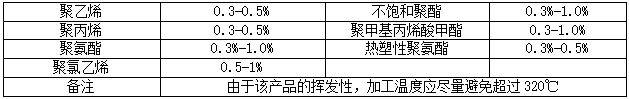 揮發(fā)度(TGA,20℃/min 在空氣中):240℃時重量損失為35.2%. 但加入 過程的揮發(fā)性取決于在材料中的溶解度、加工及設(shè)備參數(shù)等,因此相對比較低。